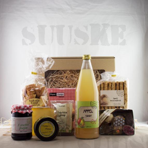 Handgemaakte bonbons van chocolaterie Albert is kwaliteit van de bovenste plank en die zitten ook in dit cadeaupakket Boerin Suuske; een goedgevuld pakket om iemand eens echt te verwennen!